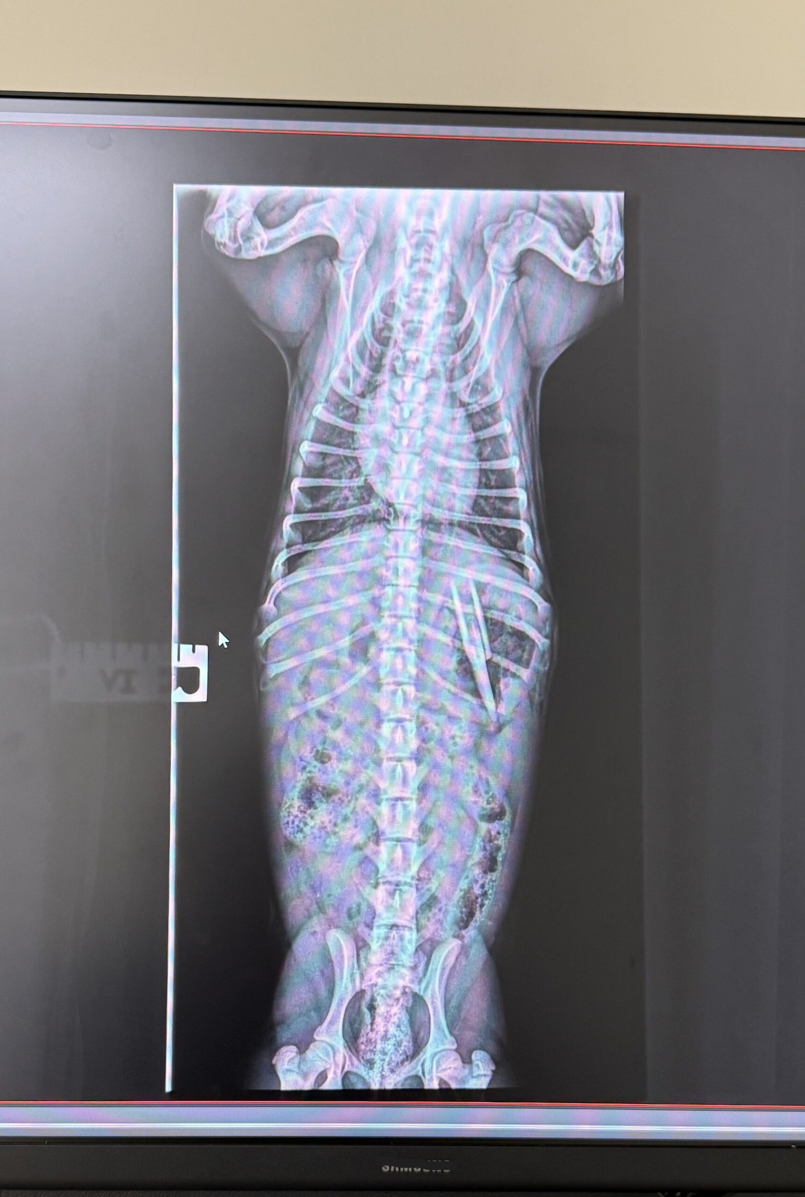 Meet this little cutie Remi. She is a 4 month old bundle of joy, but don’t let that foul you. She has a little rebellious side. Mom noticed she was playing with a spatula, first thing to do is grab the handle-as everyone would- but she decided to chomp her teeth down and as mom pulled the top of the spatula stayed in Remi’s mouth and of course as you should, she swallowed it. She came down and we induced vomiting, all that showed up was kibble and cheese, radiographs were taken and there we go, you can see the spatula.